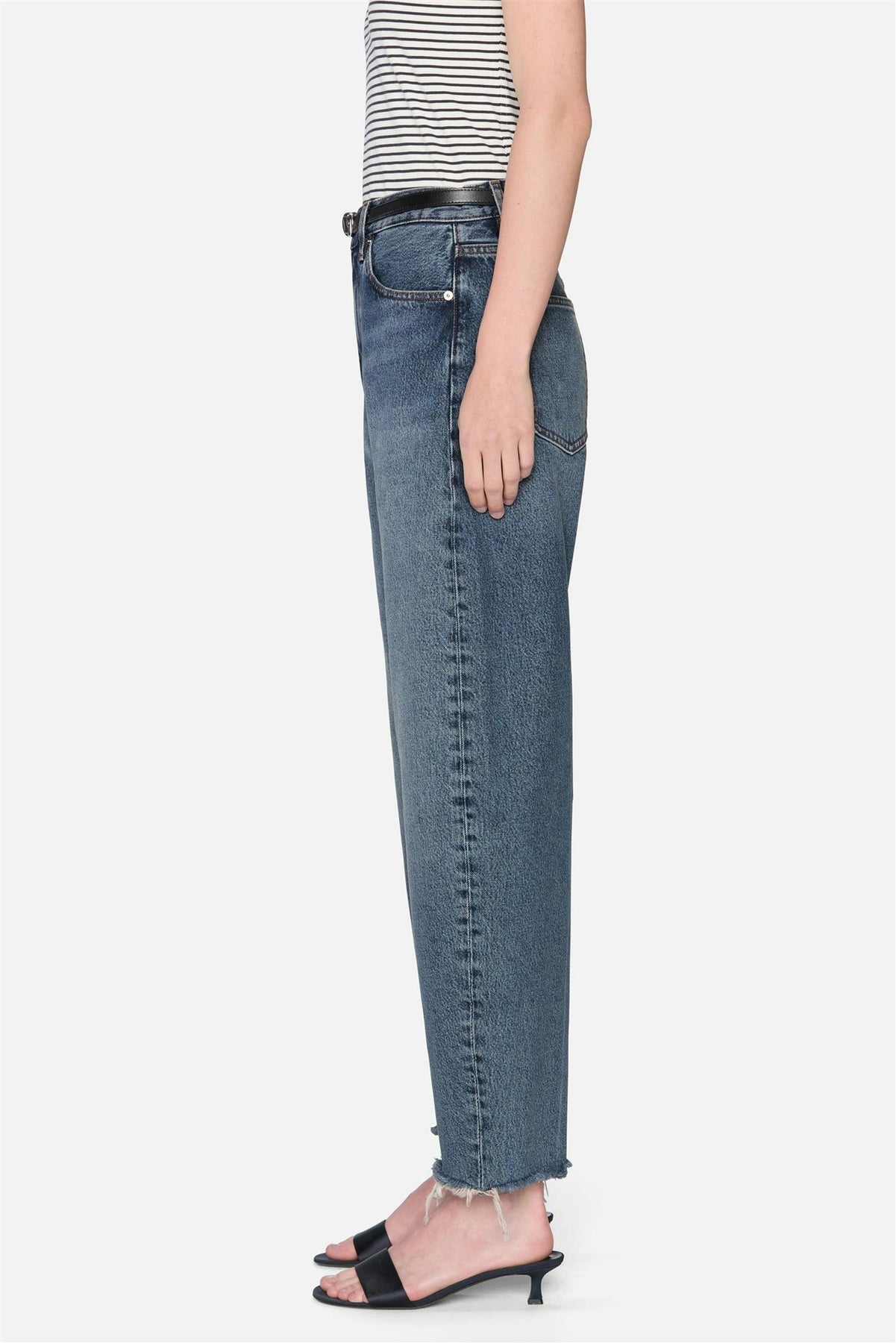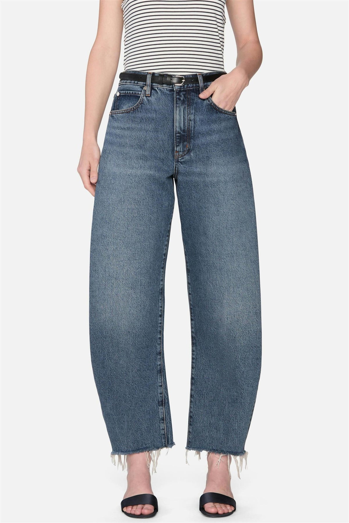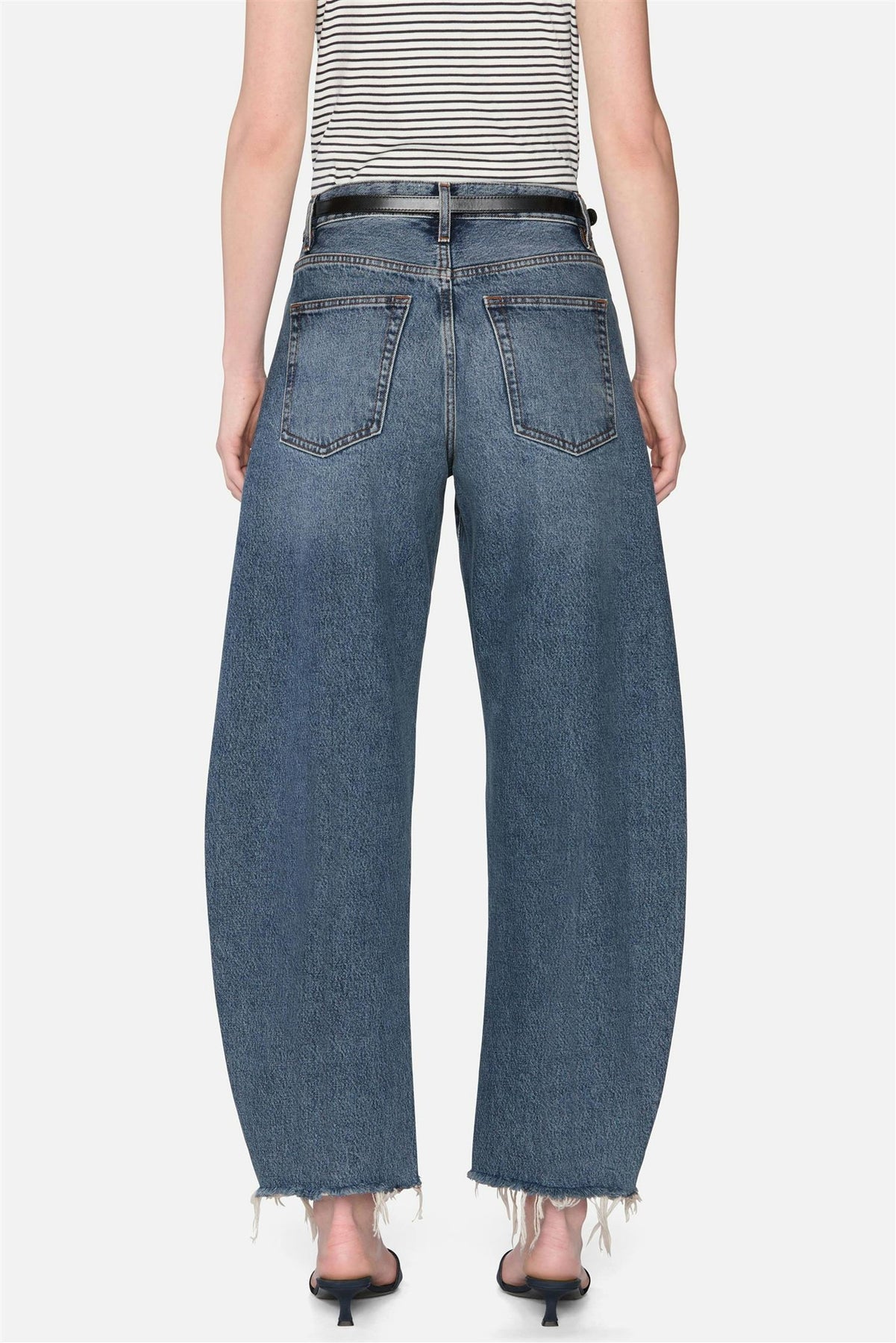 The best-selling Bubble, now with a shorter 27" inseam. The exaggerated take on the trending barrel silhouette is a unique fit and instant closet necessity. With a flattering high rise, these jeans have a curved outseam for a playful bubble effect. Note the raw, fringed hem for a pre-loved look.