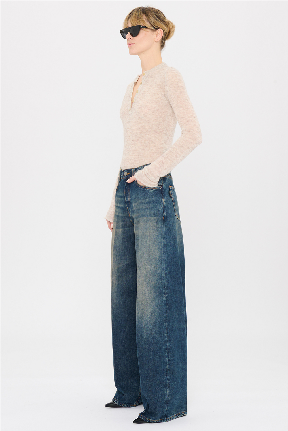 Haikure's signatyre 'Bethany' jeans are characterized by their slouchy, oversized fit. Crafted from faded blue denim, that gives a worn-in vintage feel, and featuring extra-long, wide legs that elegantly drape to the floor.