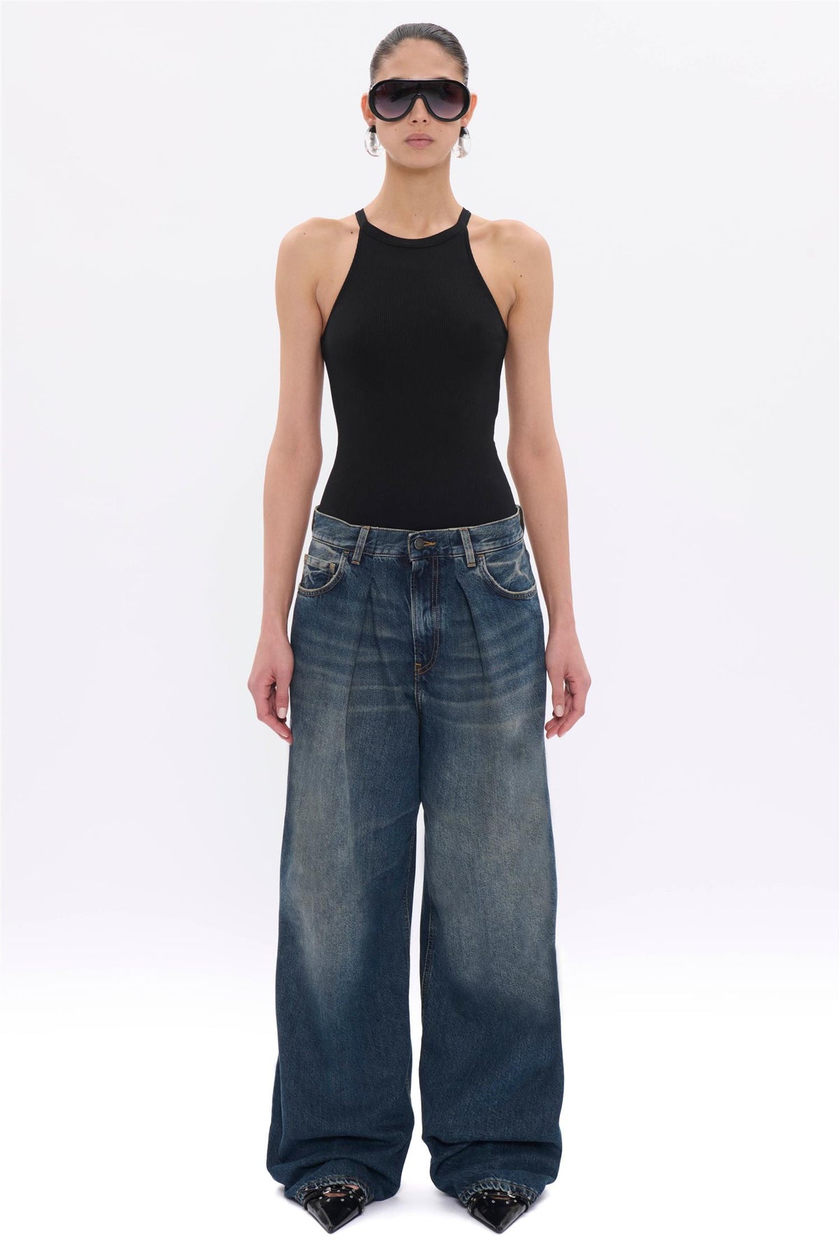 Made from non-stretch twill, the 'Candy' jeans feature loose, wide legs with pressed creases and a pleated waistband, designed to sit lower on the hips.