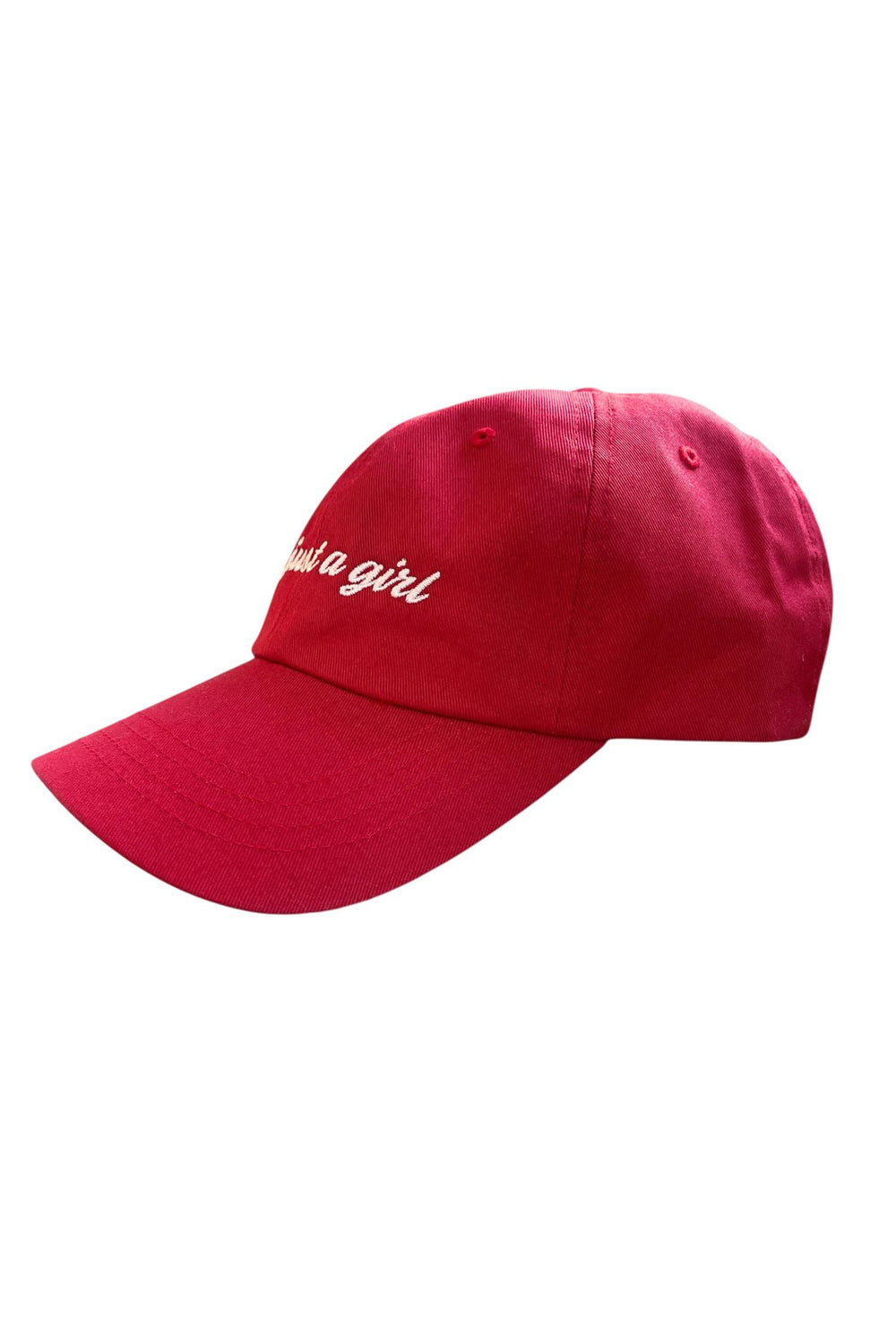 The "I'm just a girl" cap in Cranberry / pink-ish red is embroidered with white stitching.