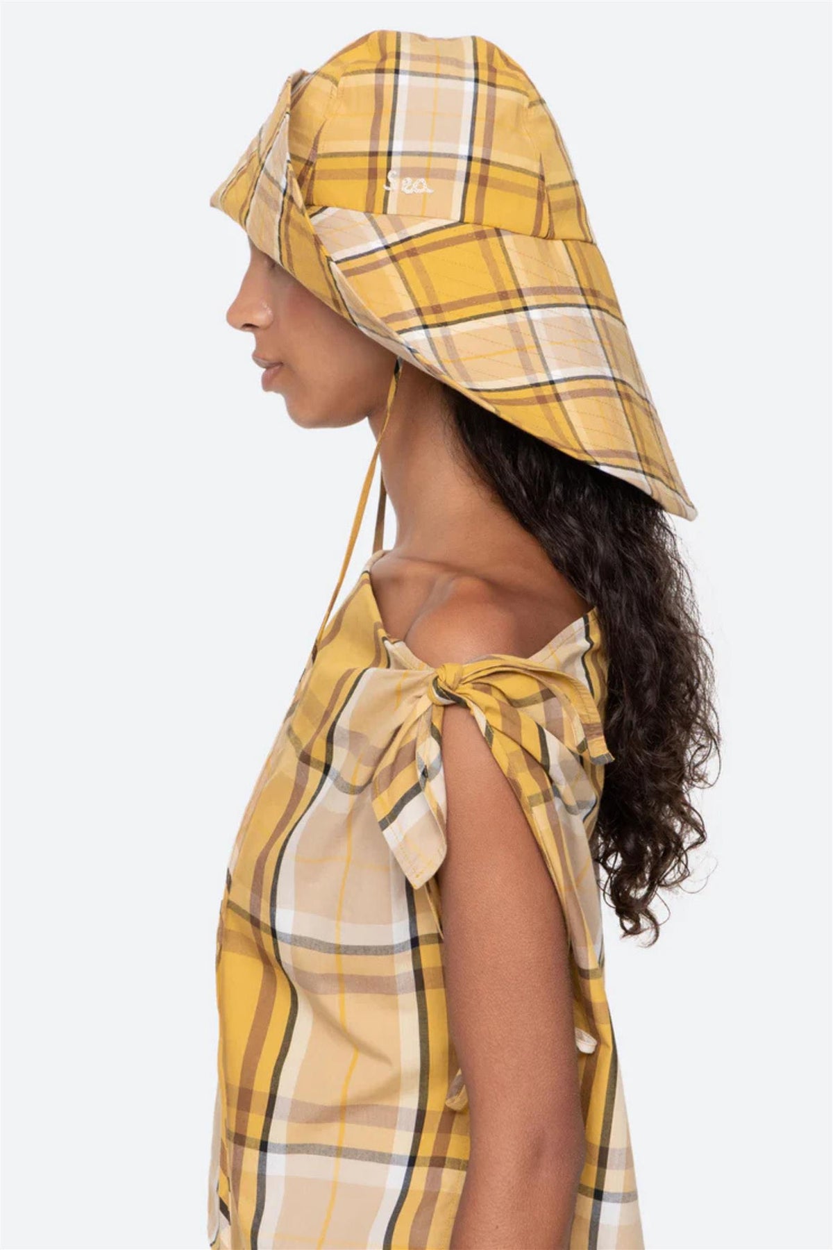The Copeland plaid hat features an oversized silhouette, finished with signature Sea embroidery at the side. Style it with the coordinating Copeland top for a polish, cohesive look.