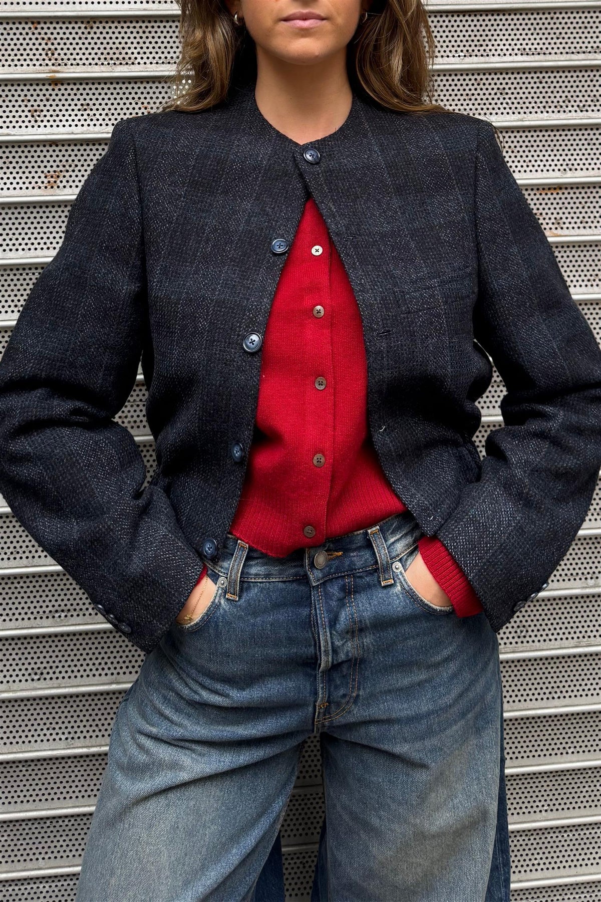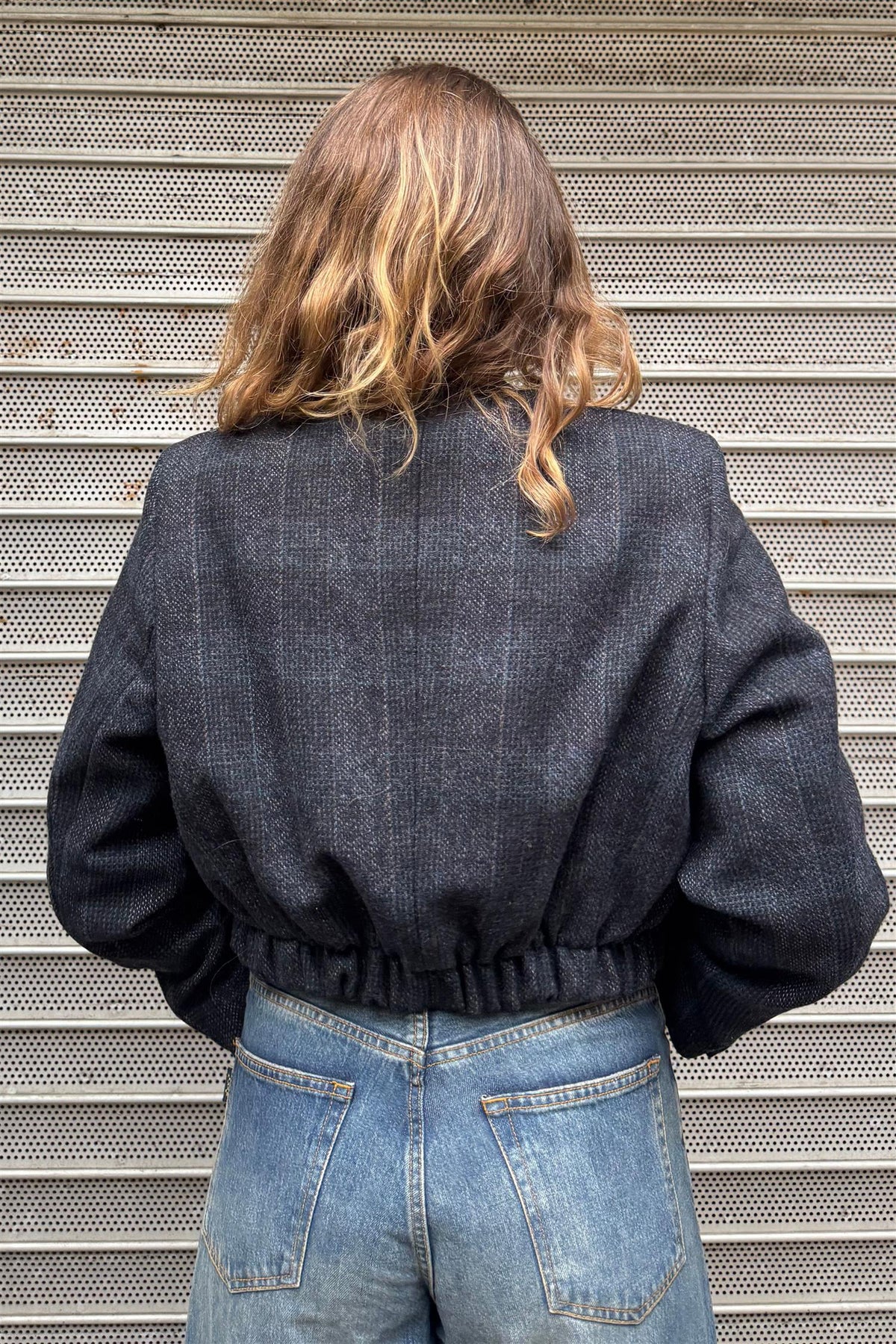 Havre Studio's iconic bomber jacket in dark blue with colored check detailing is a timeless wardrobe staple. This single-breasted piece is constructed into an oversized fit on the shoulders with a fitted, yet non-restrictive silhouette in the waist. Crafted from a vintage mens blazer in high quality wool, the bomber has a high neckline with a contemporary twist. Carefully curated, professionally tailored and professionally dry cleaned.