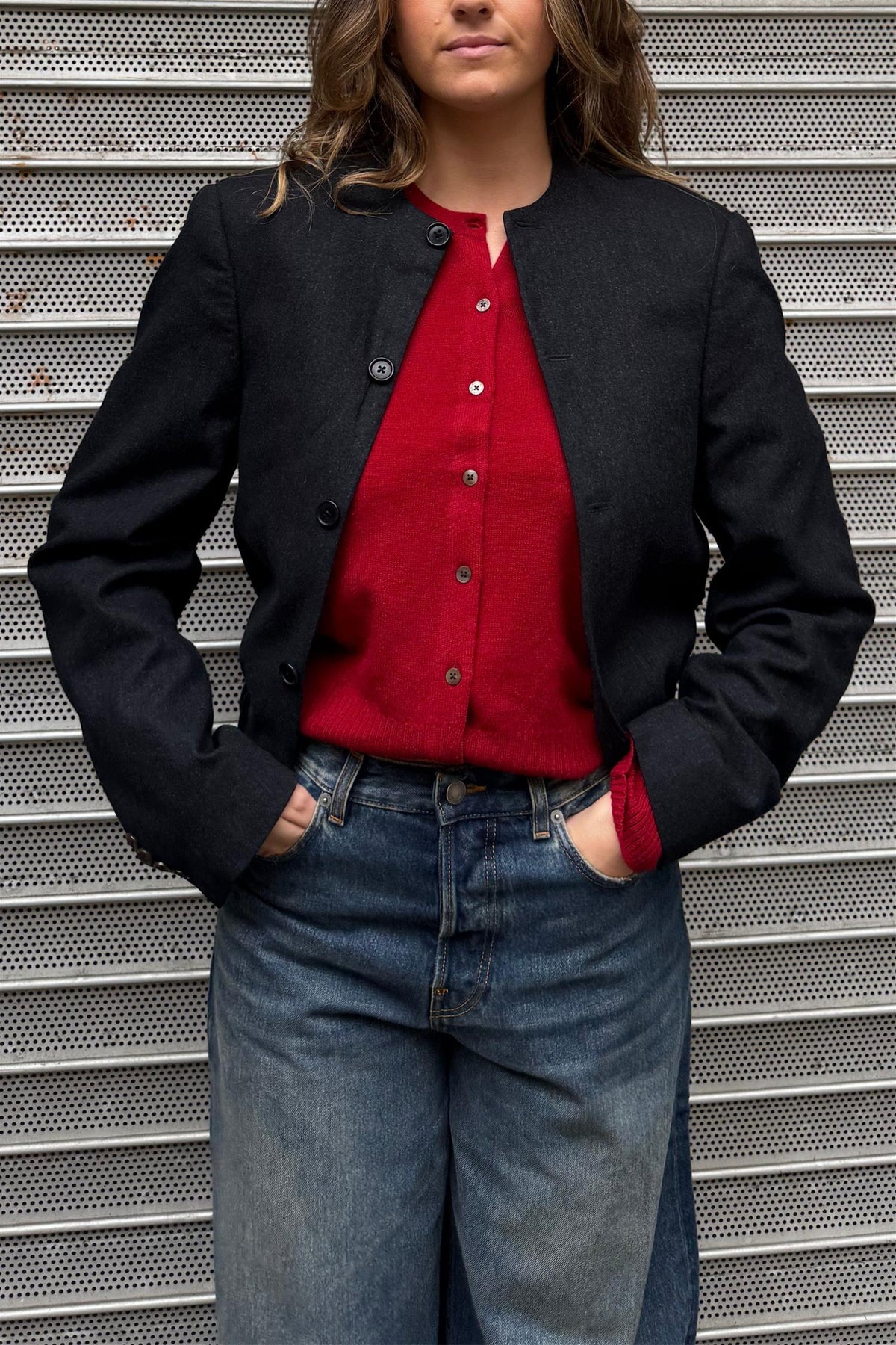 Havre Studio's iconic bomber jacket in black speckered is a timeless wardrobe staple. This single-breasted piece is constructed into an oversized fit on the shoulders with a fitted, yet non-restrictive silhouette in the waist. Crafted from a vintage mens blazer in high quality wool, the bomber has a high neckline with a contemporary twist. Carefully curated, professionally tailored and professionally dry cleaned.