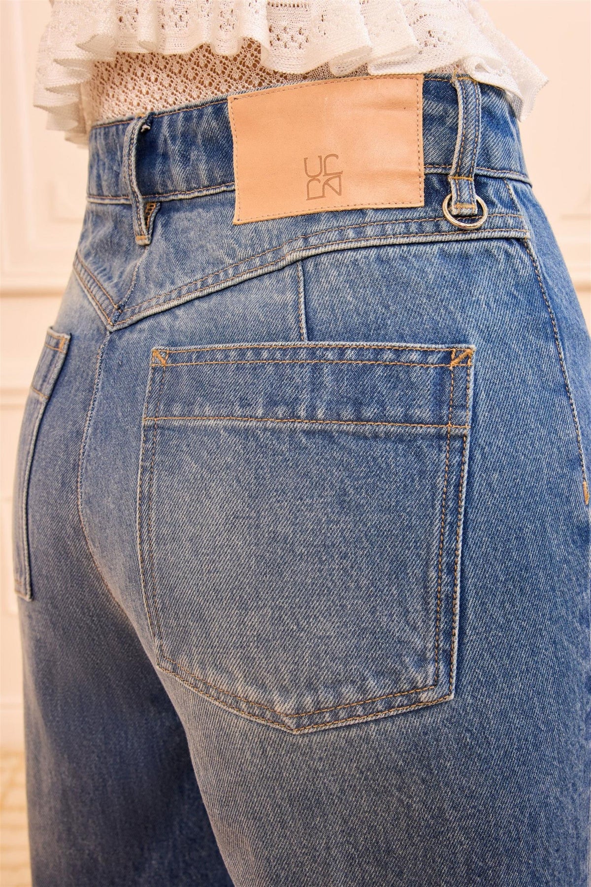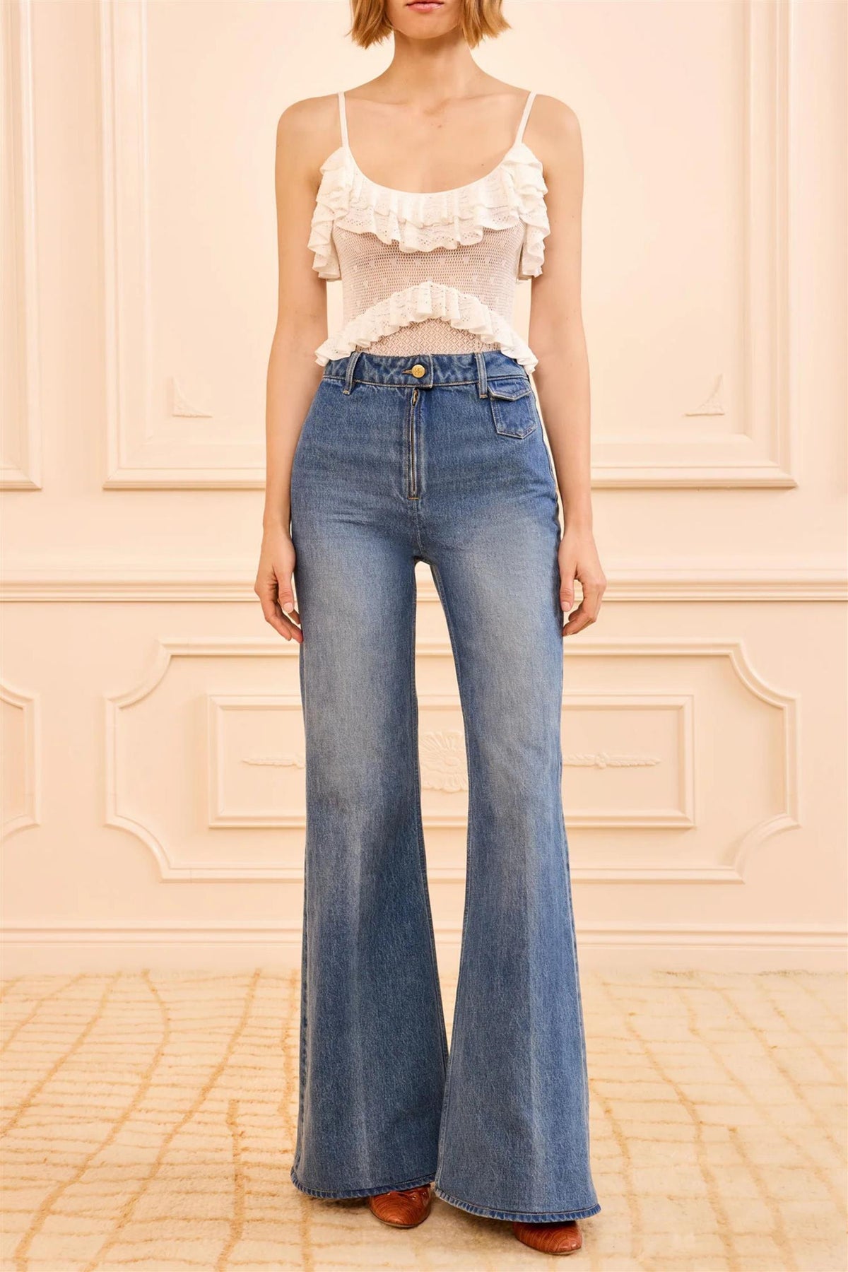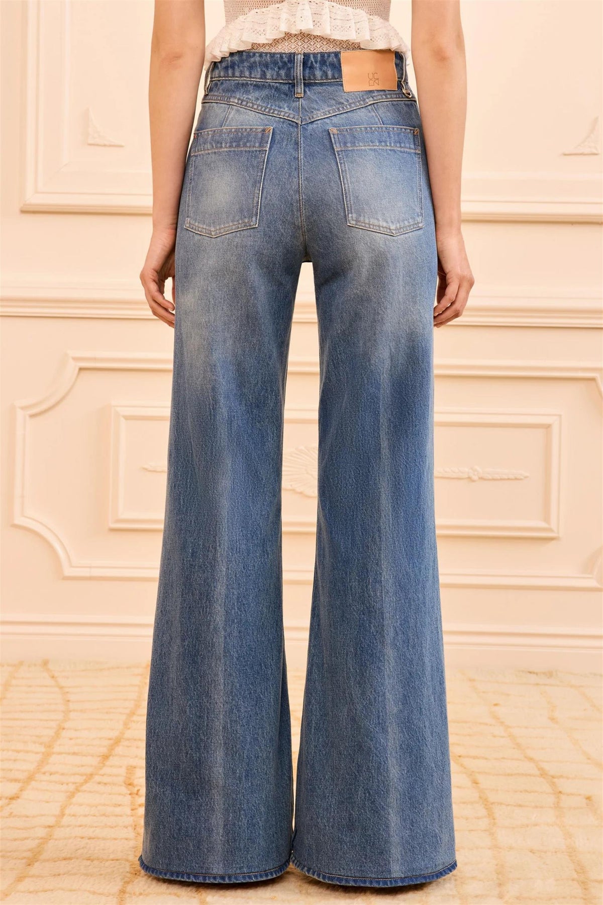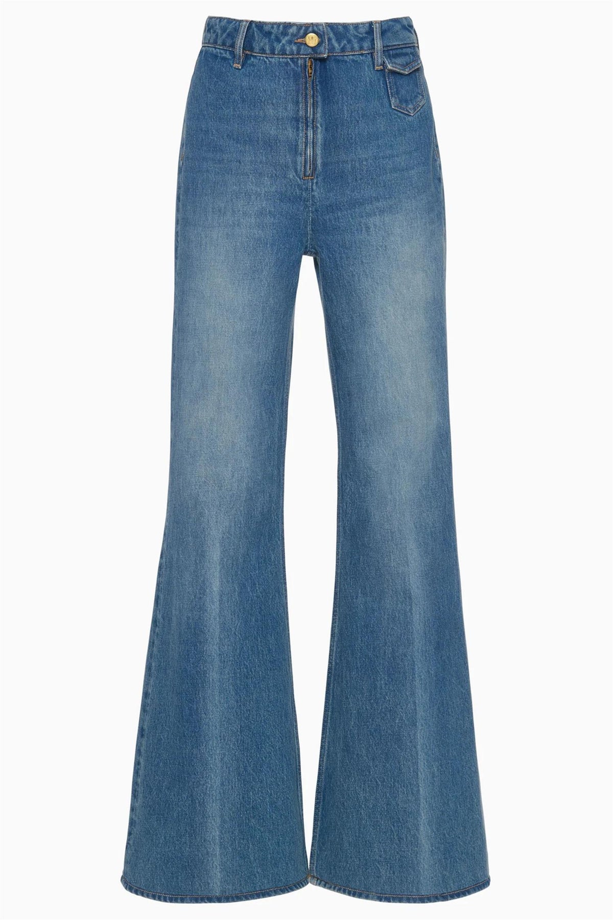 Drawing inspiration from the '70s, these high-rise wide-leg jeans feature a lightly faded Danube blue wash for a lived-in feel that effortlessly elongates the silhouette. A coin pocket detail at the front adds a refined vintage touch.