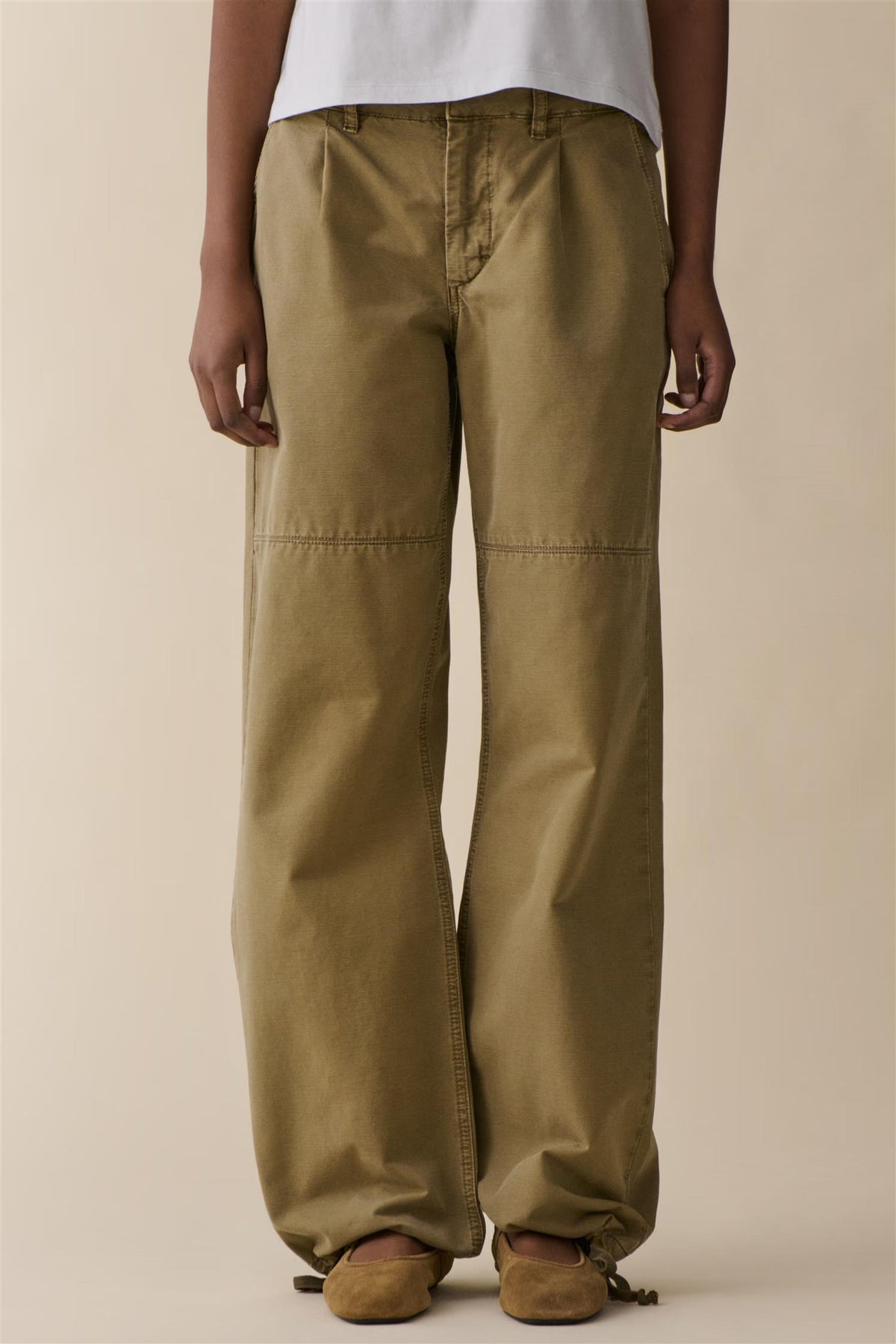 'Mina' is a chino-inspired utility trouser featuring a low-rise silhouette with a loose fit. The design includes a drawstring hem, pleats at the waist, and a seam above the knee for a structured look.
