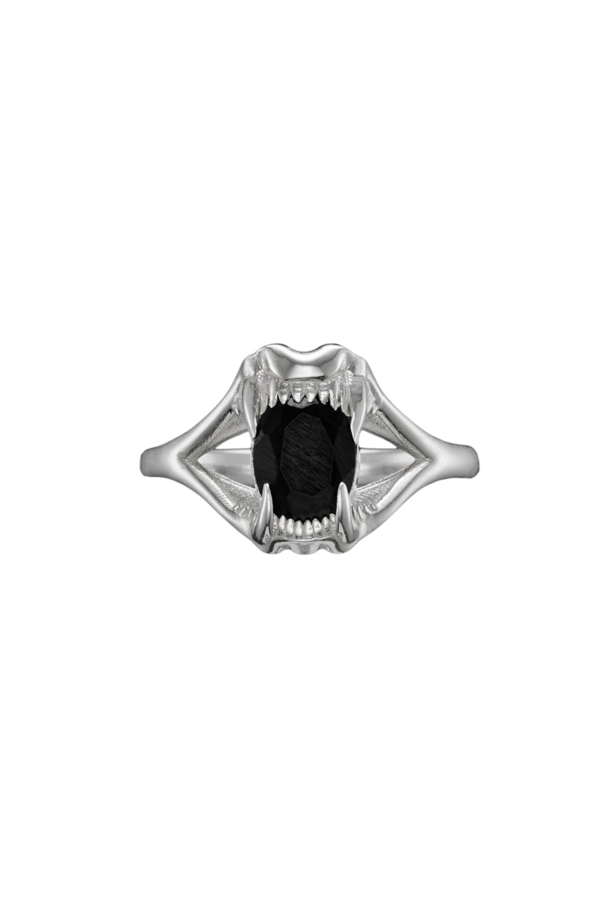 Sterling silver ring featuring a black spinel held by teeth-like prongs.