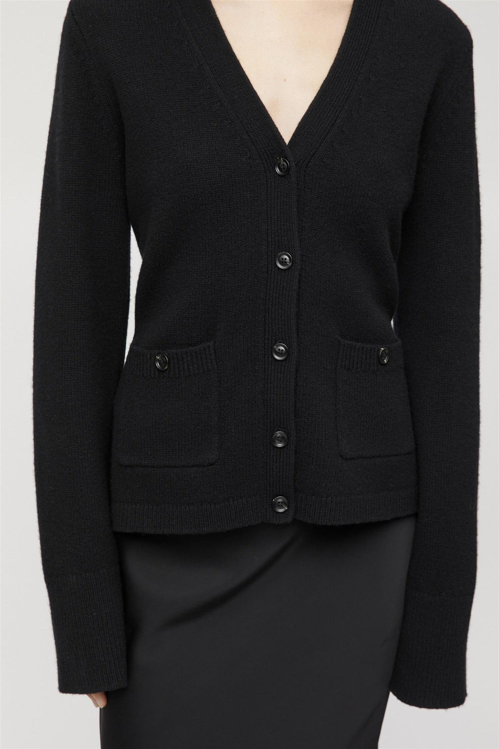 The FWSS Adele Cardigan is crafted from 100% brushed extrafine merino wool, ensuring a luxurious feel and comfort. Designed with a shaped waist, this cardigan features a delicate button-down closure, a classic ribbed v-neck and slightly oversized bell-shaped sleeves that add extra elegance to its chic silhouette. The Adele cardigan is a versatile piece for creating elevated, everyday looks. Pair it with the FWSS Double Poncho, Eileen tights and loafers for a stylish look.