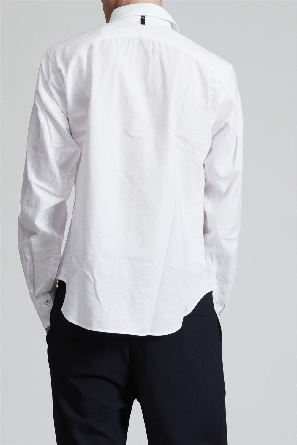 - Cotton yarn dye oxford shirting, cotton combo at internal back yoke and cuffs, side tab embroidery in ivory, 20l metal buttons down center front