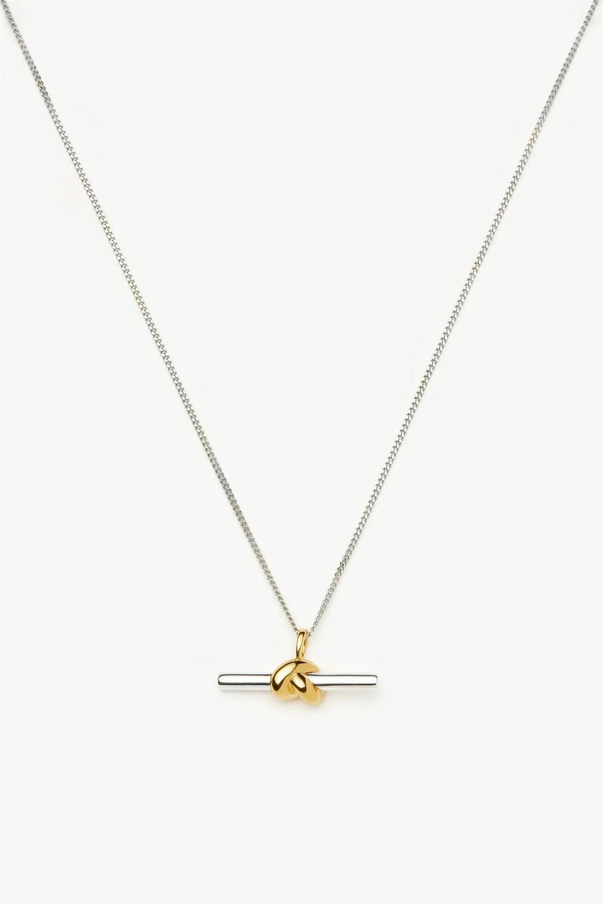 Lucy Williams’ beloved T-bar design, reimagined. This timeless necklace features a gold knot wrapped around a silver bar. Elevate by pairing with the Lucy Williams Knot Small Hoops or Stacking Ring.