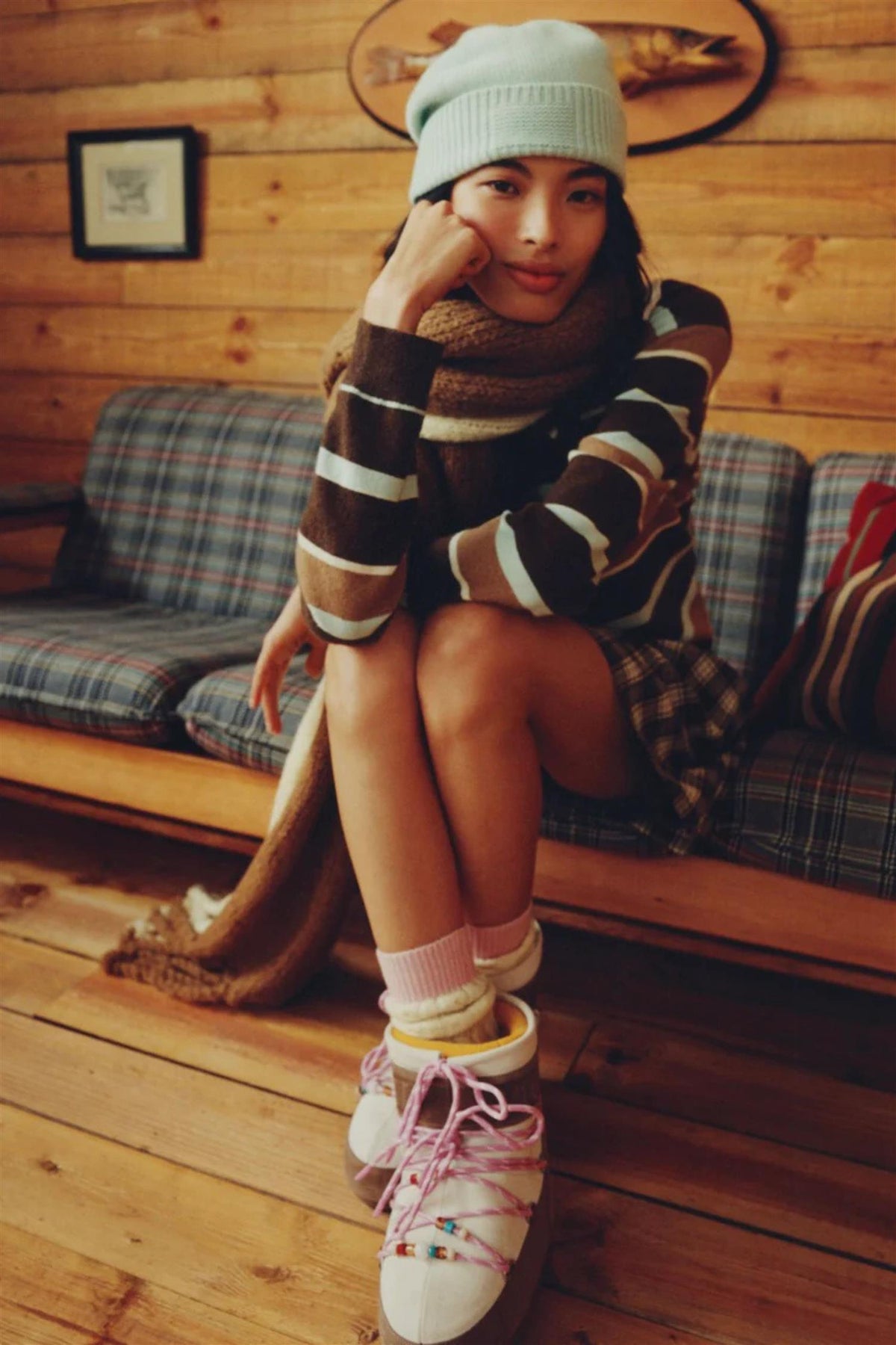 Moon Boot and rising knitwear brand Guest in Residence partner for the first time on the Moon Boot Icon Low, combining functionality with a distinctly fashion-forward aesthetic. This model features color-block panels of velvety suede, colorful beaded accents, contrasting laces, and distinctive branding that radiate casual-cool vibes.