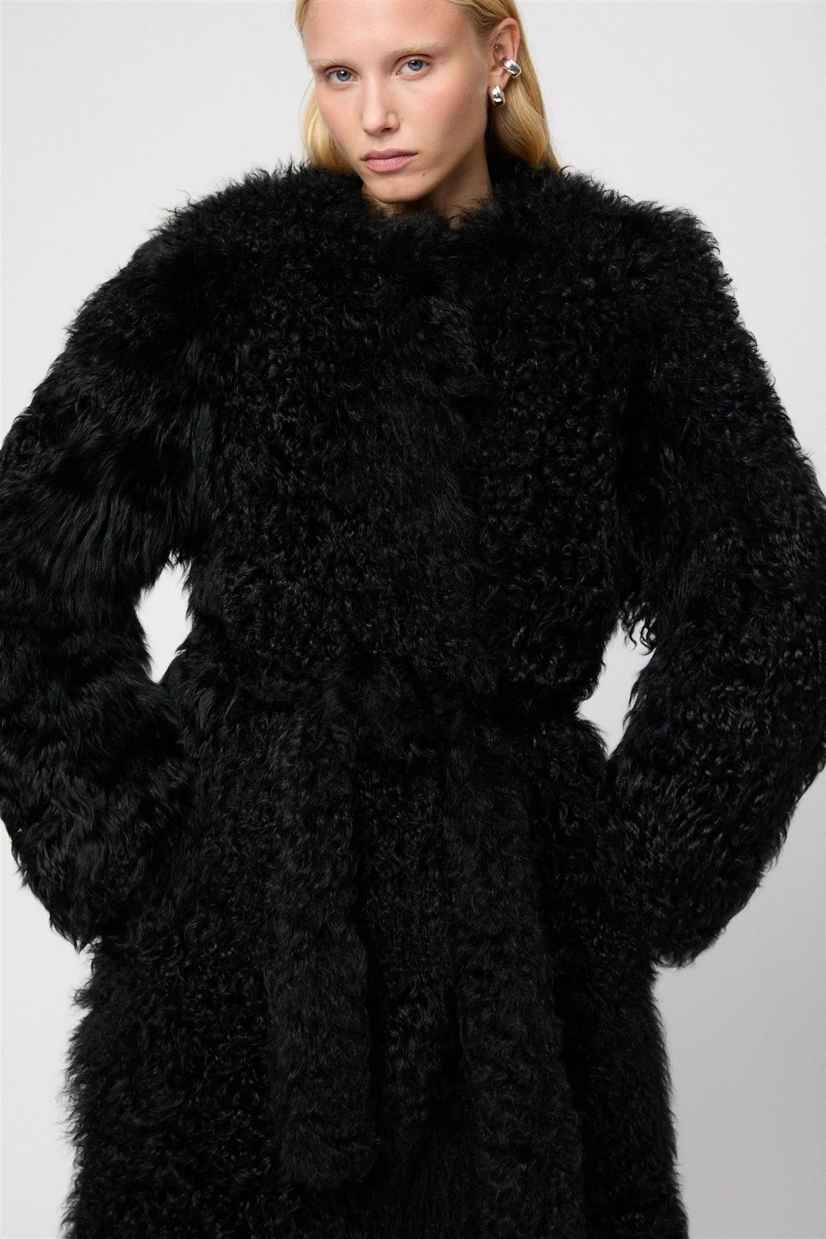 The FWSS Bergamo Shearling Coat in curly lamb shearling brings texture to a classic shape. Fully lined and detailed with clean edges, side seam pockets, and a subtle hook-and-eye closure. A waist belt adds definition and ease, making it a statement piece to carry through the coldest days.