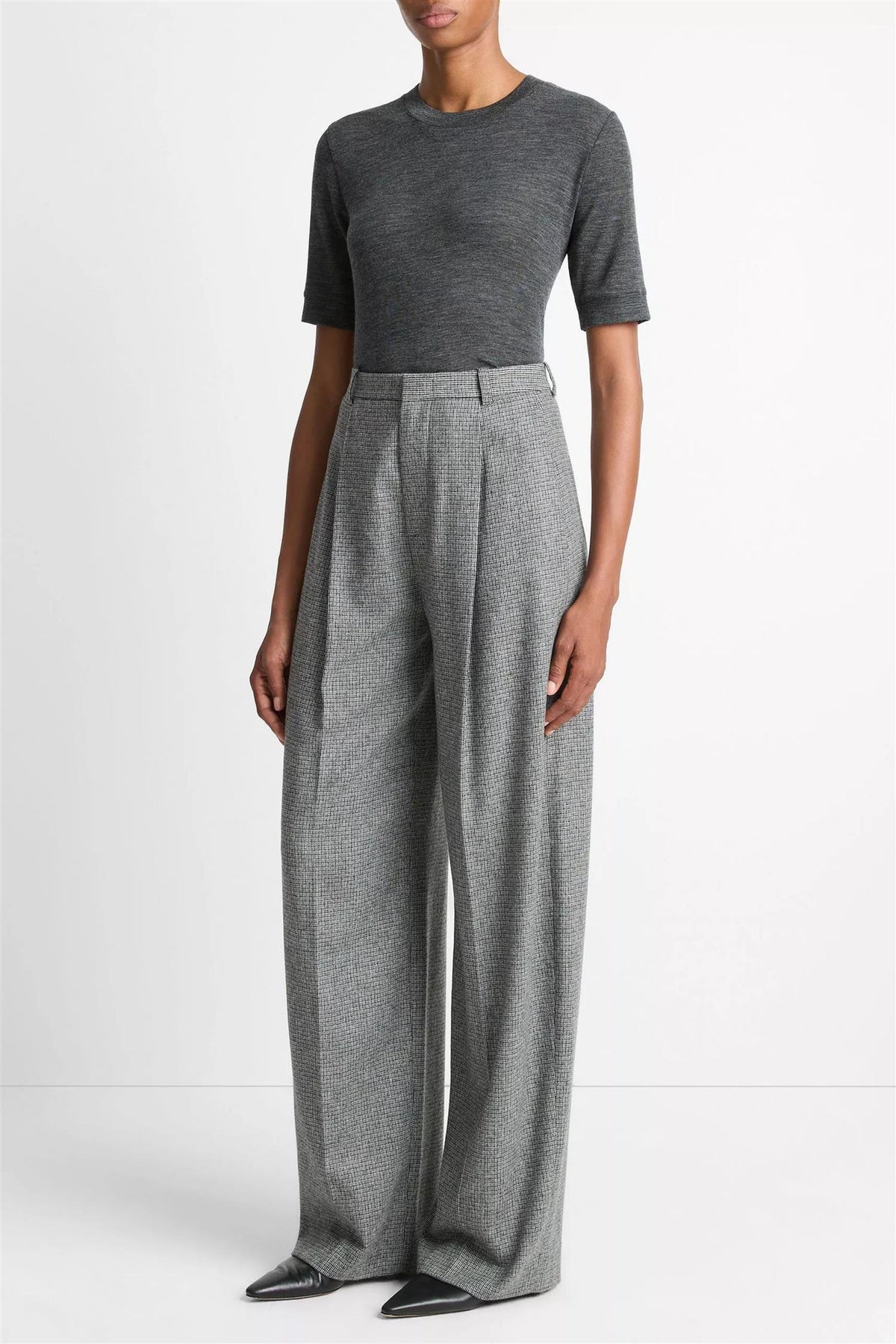 Traditional fabrics and patterns underpin Vince's Fall Collection. This wide-leg trouser is crafted from a soft Italian wool blend in a timeless, black-and-white small-scale check. It's finished with all the classic tailored details, like a pleated front and creased legs.