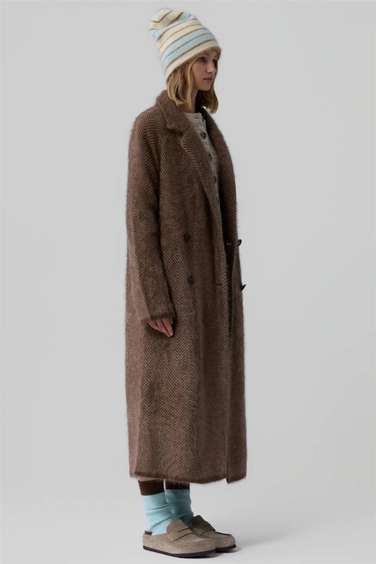 The Grizzly Double Breasted Coat is a statement women’s cashmere coat crafted from 100% brushed cashmere with a two-tone herringbone jacquard. This long cashmere overcoat features side pockets and a soft, grizzly-washed texture; an heirloom-quality piece designed to stay in a wardrobe for years to come.