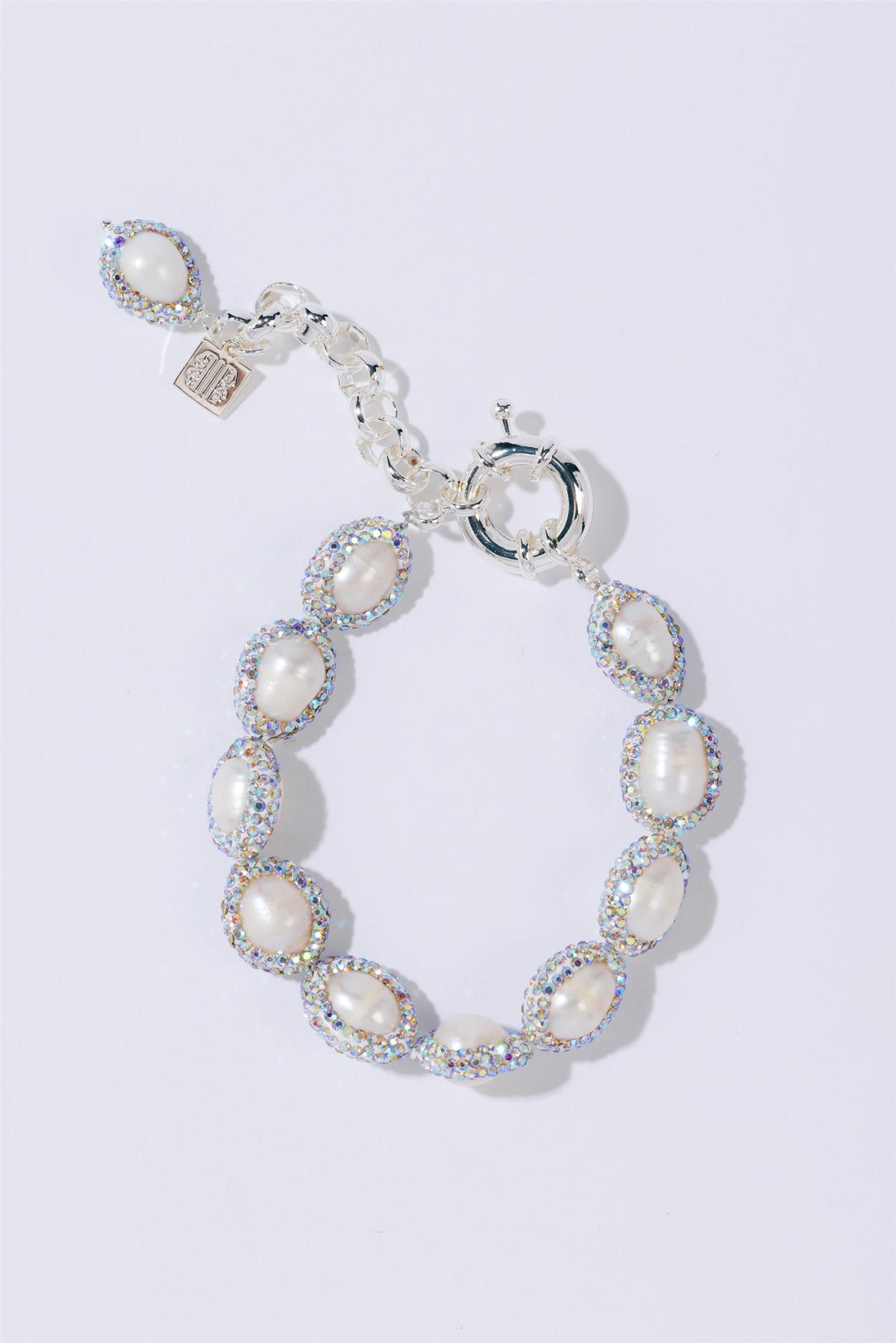 Bracelet featuring rhinestone covered freshwater pearls.