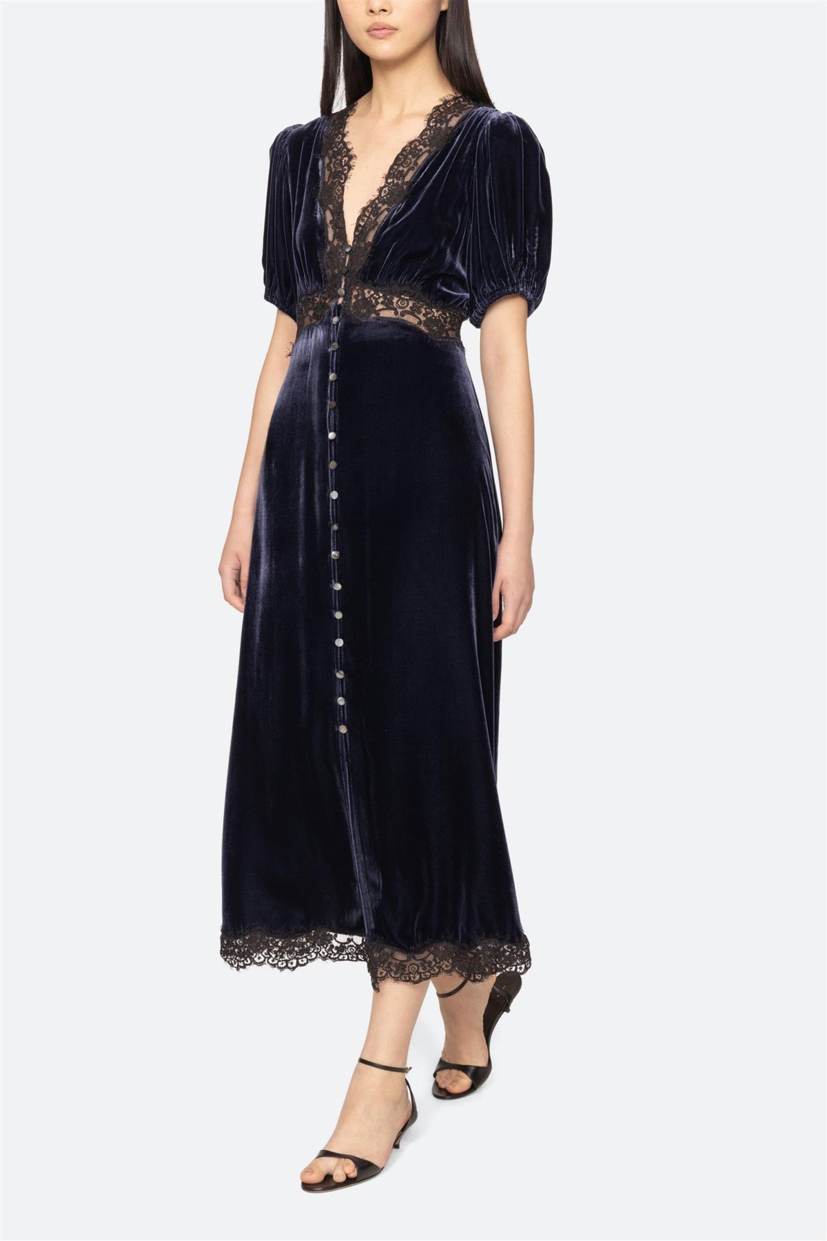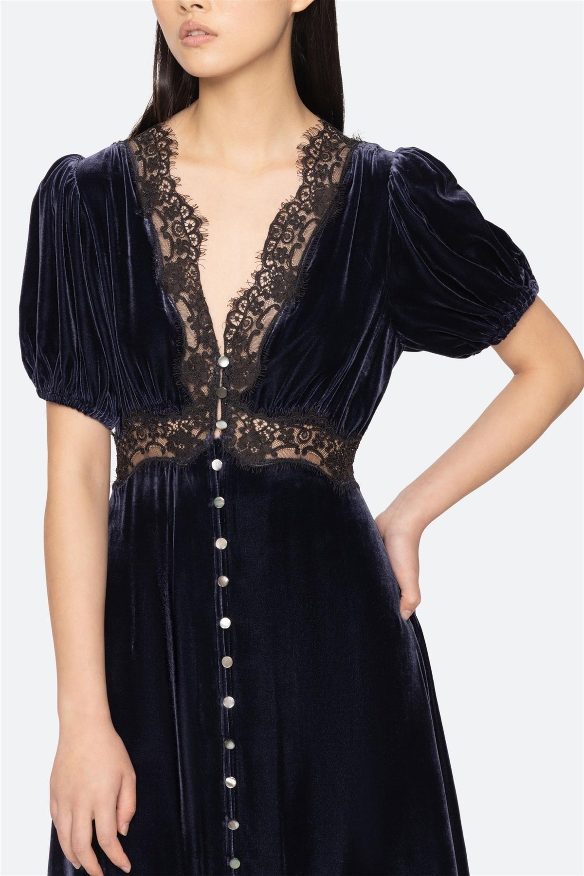 Clarice Velvet Puff Sleeve Midi Dress Navy