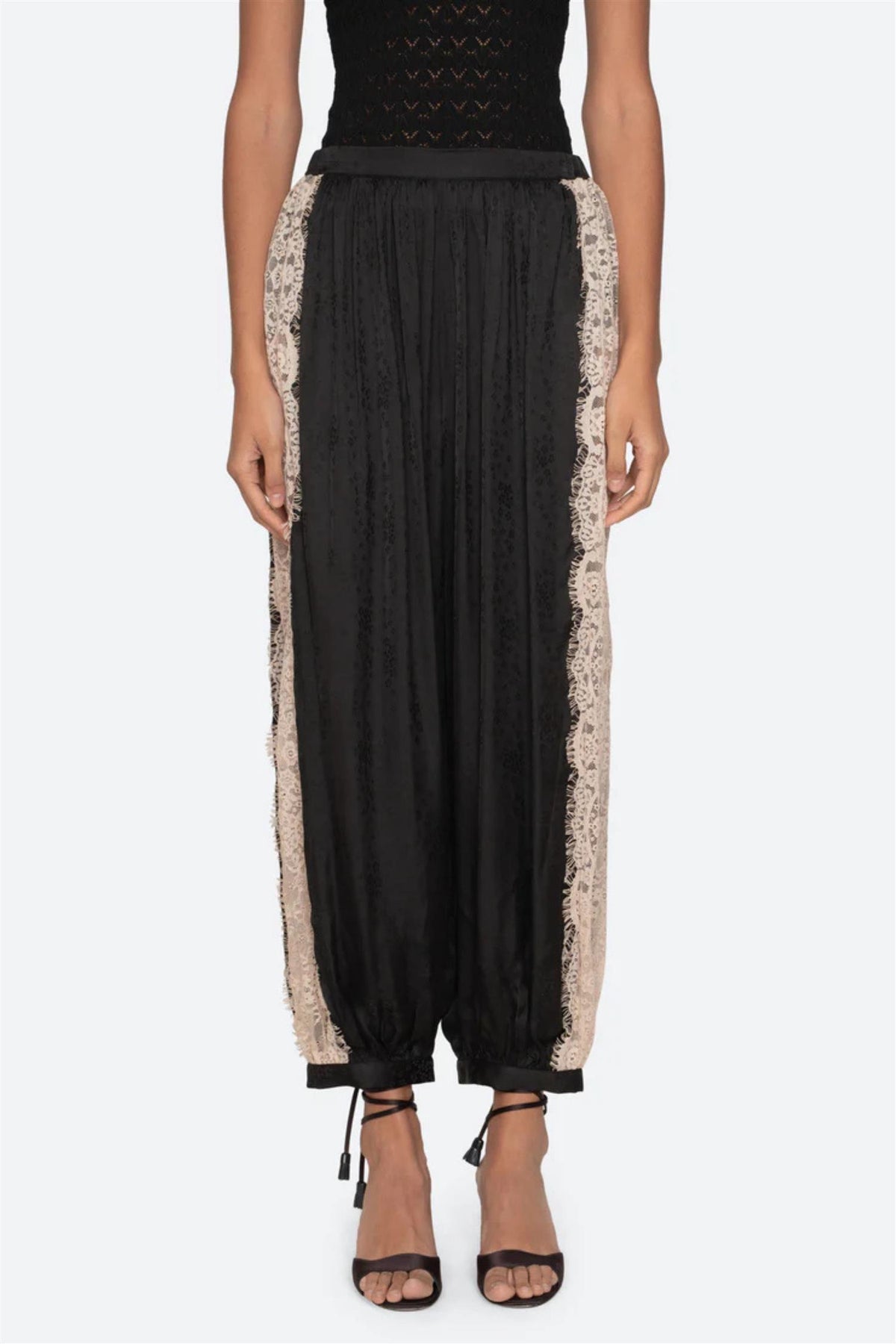 The Ethel bloomer pants feature a delicate floral motif with intricate lace inserts and an elasticized waistband for a comfortable fit. They pair effortlessly with the Ethel camisole or mini dress, creating a cohesive and feminine ensemble.