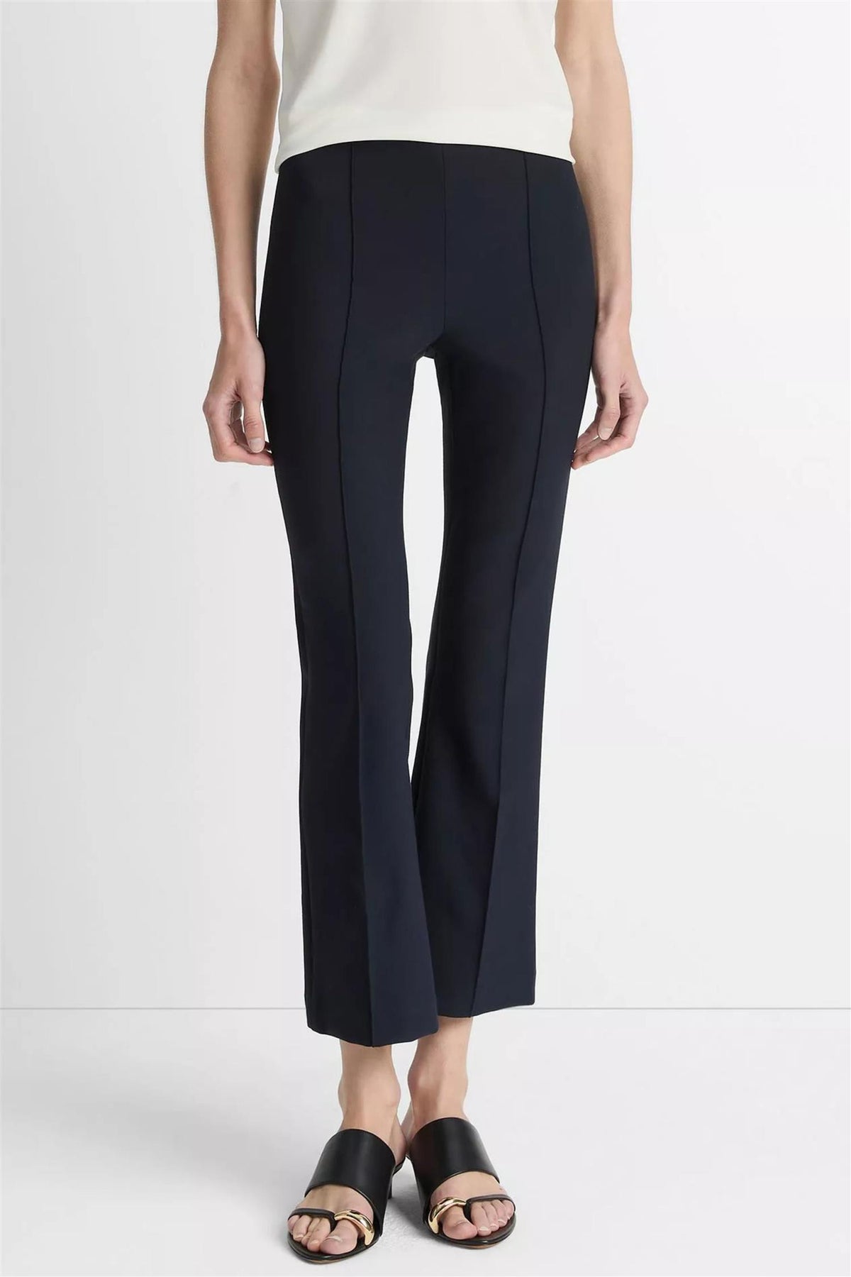 A foundational, versatile silhouette, our Niki pant is cut from an Italian cotton-blend bi-stretch fabric and finished with pintuck legs. Designed to sit at the natural waist, this pair fits close to the hips and thigh and softly fans out at the knee, hitting just above the ankle.