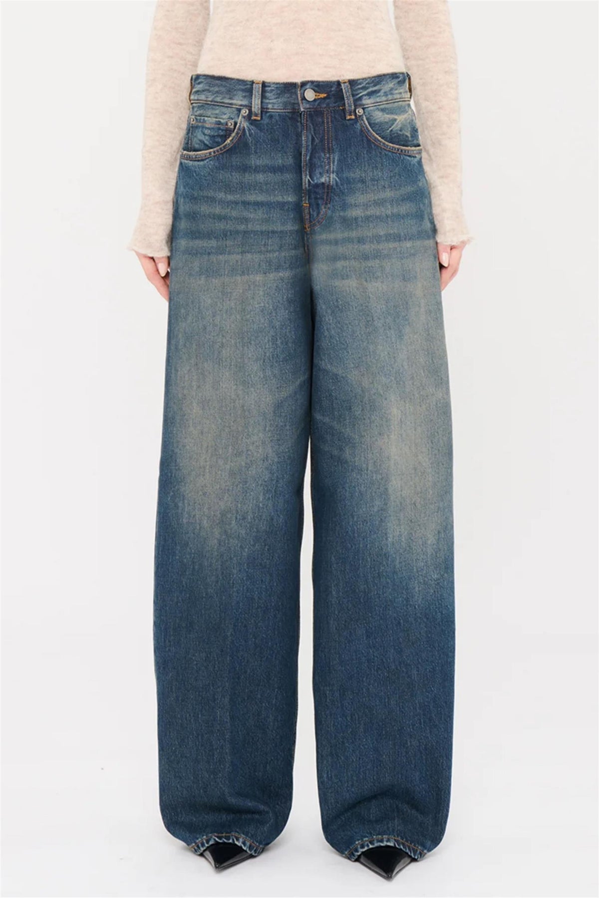 Haikure's signatyre 'Bethany' jeans are characterized by their slouchy, oversized fit. Crafted from faded blue denim, that gives a worn-in vintage feel, and featuring extra-long, wide legs that elegantly drape to the floor.