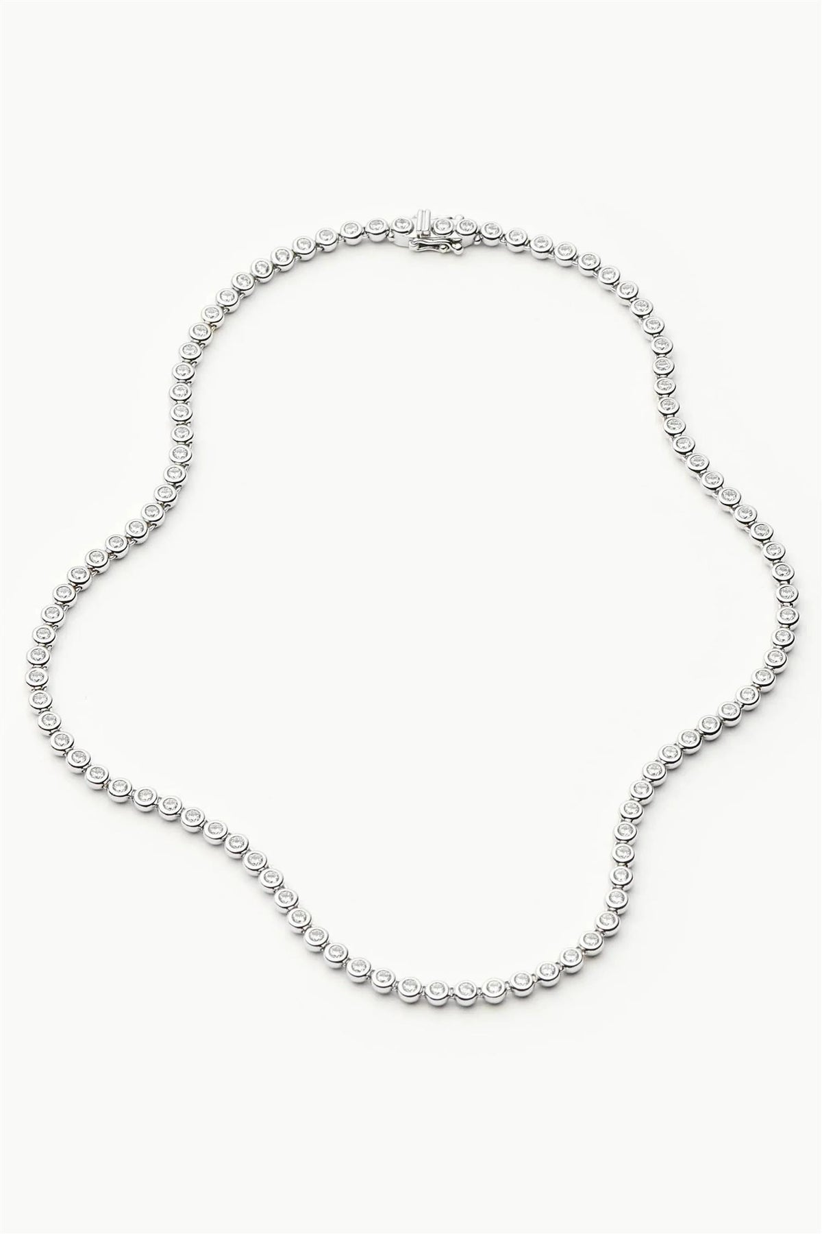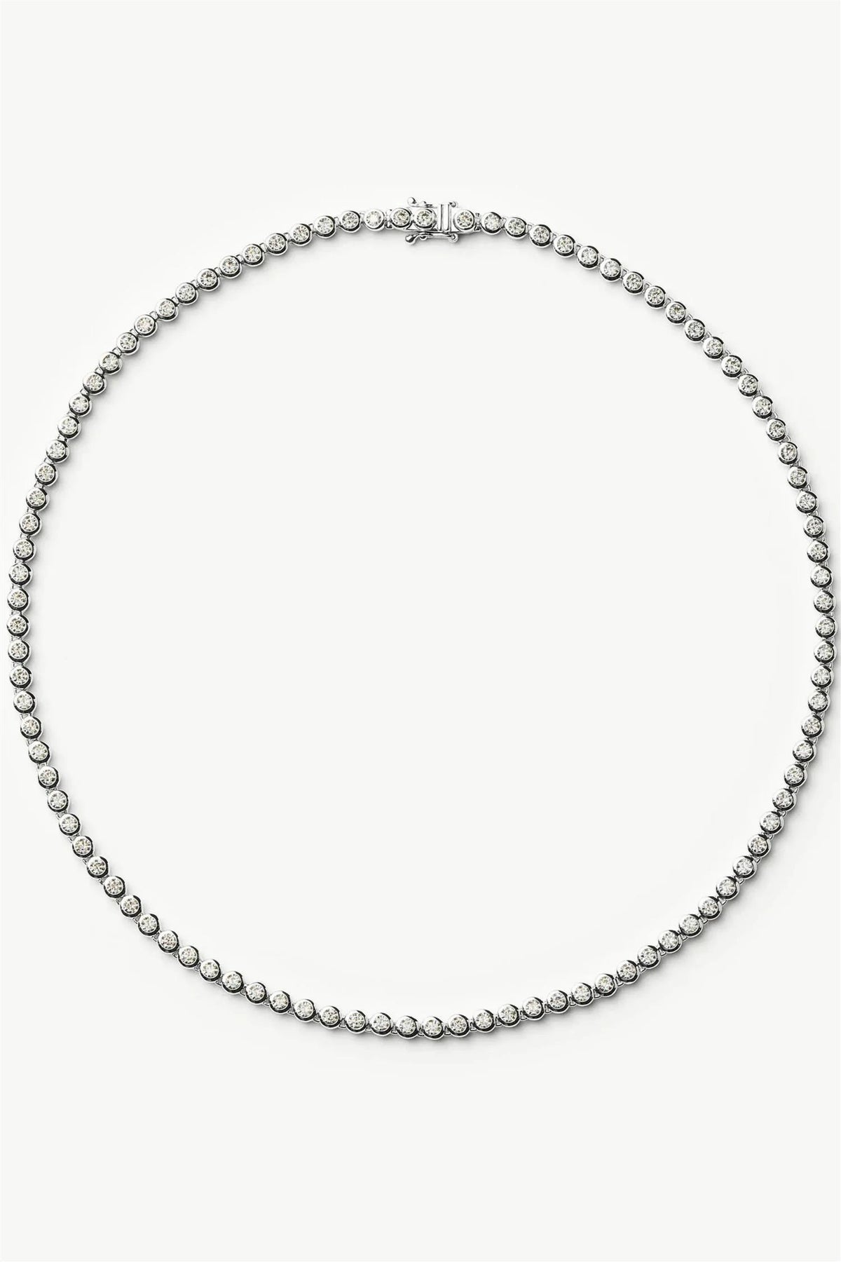 A timeless necklace with beaded detailing and embellished with rounded cubic zirconia stones. The classic box clasp features both a double-ridged push-button closure and a lever closure for added security. Each individual piece in our Tennis Collection takes 24 hours to craft by hand. Style with the Tennis Round Bracelet or Small Hoop Earrings to achieve the ultimate set.